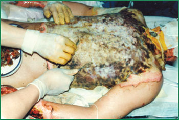 2、 對胸部Ⅲ度燒傷創(chuàng)面進行耕耘減張術,敷用MEBO,采取燒傷濕潤暴露療法(MEBT)治療。