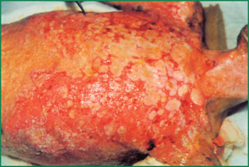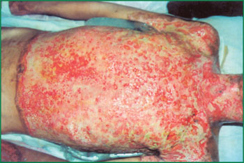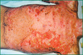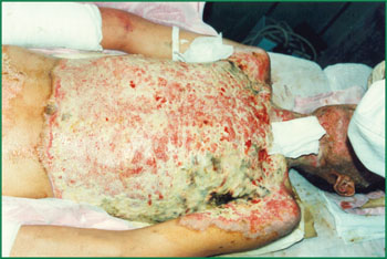 1、 Ⅲ度燒傷占總面積85%的病人,右側(cè)為皮膚全層壞死(病理切片)。
