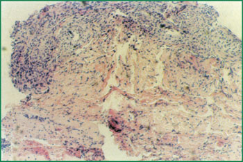 4、 燒傷壞死皮膚液化排除創(chuàng)面形成纖維隔離膜,新生的皮膚組織再生復原創(chuàng)面(病理切片),(傷后第20天)。