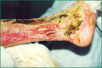1、 小腿脛骨下段燒傷創(chuàng)面的表現(xiàn)。