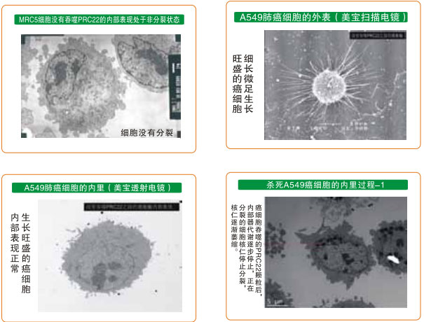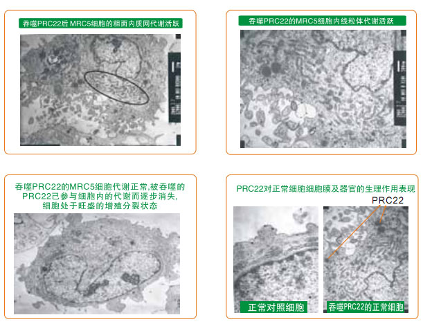 在獲得再生物質(zhì)對(duì)癌細(xì)胞生命作用研究結(jié)果的基礎(chǔ)上,我們選人胚肺MRC5細(xì)胞作為正常細(xì)胞,人肺癌A549細(xì)胞作為癌細(xì)胞,用人肺組織的再生營(yíng)養(yǎng)物質(zhì)作為試驗(yàn)物質(zhì),對(duì)正常細(xì)胞和癌細(xì)胞進(jìn)行體外培養(yǎng),觀察再生物質(zhì)進(jìn)入細(xì)胞內(nèi)是如何產(chǎn)生作用的。其結(jié)果為,正常細(xì)胞吞入再生物質(zhì)后,細(xì)胞內(nèi)的各個(gè)器官代謝旺盛,細(xì)胞核分裂表現(xiàn)活躍,再生物質(zhì)在細(xì)胞內(nèi)被代謝消耗;沒(méi)有加入再生物質(zhì)培養(yǎng)的正常肺細(xì)胞對(duì)照組的細(xì)胞,沒(méi)有產(chǎn)生明顯的增殖變化。而肺癌細(xì)胞吞入再生物質(zhì)后,細(xì)胞內(nèi)各器官代謝立即停止,第一天,細(xì)胞自斷偽足,細(xì)胞內(nèi)的線粒體腫脹死亡,細(xì)胞核仁萎縮,吞入的再生物質(zhì)沒(méi)有發(fā)生代謝消耗性反應(yīng),第二天后細(xì)胞凋亡性死亡,吞入的再生物質(zhì)完好無(wú)損。如此的試驗(yàn)結(jié)果認(rèn)為,再生物質(zhì)對(duì)正常細(xì)胞內(nèi)各器官的作用是一種再生營(yíng)養(yǎng)素,而對(duì)于癌細(xì)胞內(nèi)的器官則是致死性物質(zhì)。試驗(yàn)結(jié)果還表明,再生物質(zhì)的作用首先發(fā)生在細(xì)胞質(zhì)內(nèi)的器官中,而后影響細(xì)胞核內(nèi)。這樣的結(jié)果所見(jiàn)可能是人類(lèi)攻克癌癥的一個(gè)嶄新途徑。(參見(jiàn)下列系列電鏡圖片)