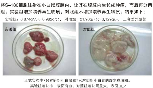 將S-180細(xì)胞,注射到小白鼠腹腔內(nèi),讓其在腹腔內(nèi)形成腫瘤組織,在形成一定大小時(shí)分為兩組,一組增加一定量再生物質(zhì)的喂養(yǎng)(實(shí)驗(yàn)組),一組不加再生物質(zhì)喂養(yǎng)(對(duì)照組)。一段時(shí)間后,將小白鼠腹腔內(nèi)的腫瘤組織取出,進(jìn)行稱(chēng)量,喂養(yǎng)再生物質(zhì)組的小白鼠腫瘤組織塊明顯地小于沒(méi)有喂養(yǎng)再生物質(zhì)組小白鼠腹腔內(nèi)的腫瘤組織塊,數(shù)據(jù)是:實(shí)驗(yàn)組0.982g/只,對(duì)照組3.12g/只,且腫瘤組織的顏色外觀明顯不同。