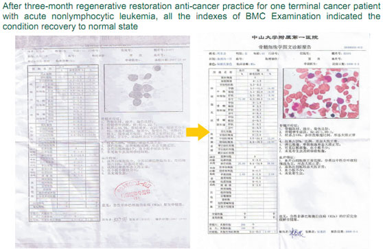 The second case is a leukemia patient.  Though leukemia is considered as a challenging disease, it is not so tough for our therapy.  In our animal study, regeneration of the bone marrows by our method could not be hindered by 60Co radiation compared with the control group in which deterioration occurred in the marrow after radiation.  This patient was diagnosed as leukemia repeatedly relapsing,to whom the medical intervention was withdrawn.  She was admitted in our program in early February of 2008.  The latest examination on March 3rd of 2008 showed her bone marrows had been converted to normal completely with her physical condition the same with the normal people.