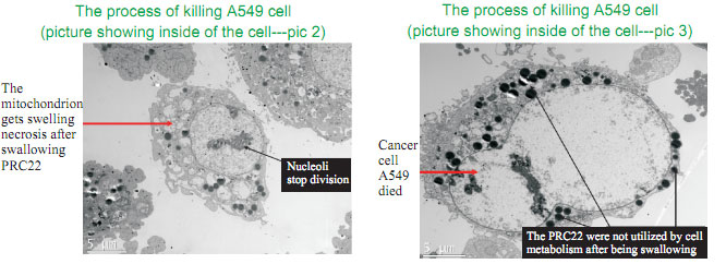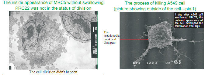 But why?  What are the mechanisms behind it?  Before I answer your question, let me show you the results from our study first.  For the morphology of the normal human lung cells cultured in MEM with regenerative nutrients, it was obvious that the normal lung cells were not only alive but began to proliferate after swallowing No.22, indicating the regenerative nutrients contained in No.22 can be used by lung cells and involved in their construction process; in addition, regeneration was throughout the development of lung cells accompanied by active division without variation.  On the contrary, no division was observed in the normal cells cultured without No.22 at the same time interval.  More surprisingly, after cancer cells were cultured in the same media with No.22, the absorbability of the cell was decreased, cell organs turned to disfiguration, which finally led to the cell death.  There are two types of cell death: apoptosis and cell disaggregation (usually with toxin release).  In our study, the death of cancer cells was determined as apoptosis for no disaggregation was observed.