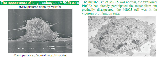 We screened total 210 types of MEBO Elixir, regenerative nutrients containing compounds, catered for various cells by culturing various potential regenerative cells with different types of MEBO Elixir like MEBO Elixir No.11, No.12, No.21, No.22, No.31 and choosing the most suitable type for the specific cell type.  Among them, there are totally 6 types of MEBO Elixir are indicated to lead to the regeneration of lung cells.  However, we found in our screening that not all the regenerative nutrients favorable for cell regeneration have the anti-cancer effect.  Thus it is necessary for us to firstly compare the effects of a certain type of MEBO Elixir on both cancer cells and normal pneumonocytes.  In our study, all of No.11, No.12 and No.22 MEBO Elixir showed the double effects of not only promoting normal cellular growth but inducing cancer cell degeneration, among which No. 22 was proved to be the most effective.  The currently practiced anti-cancer methods share the common disadvantage of killing both normal cells and cancer cells.  Our experiments produced the results that MEBO Elixir No. 22 encouraged normal cells for their growth while killing cancer cells.  After that, we performed human tests based on the above three types of MEBO Elixir by adding them into the nutrition for humans.  Different from most of the food ingredients which are all killing both normal cells and cancer cells, our MEBO Elixir could kill two birds with one stone, i.e.: support normal cell growth while killing cancer cells.
