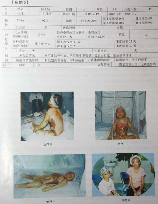 中國(guó)中西醫(yī)結(jié)合學(xué)會(huì)燒傷專業(yè)委員會(huì)全國(guó)醫(yī)療網(wǎng)廣大醫(yī)護(hù)人員應(yīng)用燒傷皮膚原位再生技術(shù)成功救治了大量的重癥燒傷患者,在歷次全國(guó)燒傷創(chuàng)瘍學(xué)術(shù)會(huì)議上,經(jīng)過(guò)專家委員會(huì)評(píng)審,已經(jīng)有100名經(jīng)治醫(yī)師獲得“全國(guó)燒傷康復(fù)明星獎(jiǎng)”,以下展示的是部分獲得獎(jiǎng)勵(lì)的大面積重癥燒傷患者應(yīng)用燒傷皮膚原位再生技術(shù)治療前、治療中和康復(fù)后的圖片和病例資料。