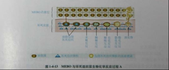 首先是MEBO中具有油脂性質的基質在創(chuàng)面溫度的溫化下,由固態(tài)的軟膏劑型轉化為液態(tài),溫化的油滴滲入創(chuàng)面,將壞死皮膚組織分割為顆粒并將其包繞,從而啟動壞死組織連續(xù)發(fā)生系列的生化反應(1-4-14)