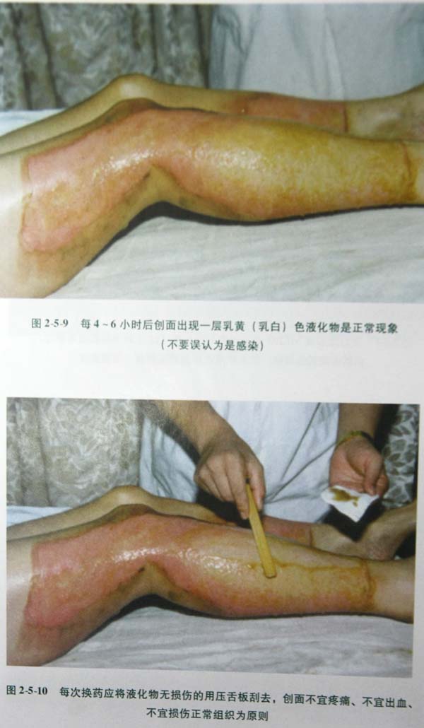 2眼觀表現(xiàn):局部紅腫明顯,起水皰、壁薄,內(nèi)含淡黃色血漿樣液體,劇痛;水皰破后創(chuàng)面可見潮紅、濕潤,質(zhì)地較軟,溫度較高。