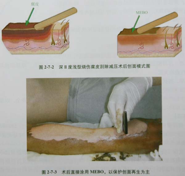 痂皮劃痕耕耘減壓術(shù)是指對深Ⅱ度深型創(chuàng)面用耕耘換藥刀耕耘燒傷創(chuàng)面壞死皮膚,減輕淤滯缺氧細(xì)胞壓力,促其恢復(fù)。深Ⅱ度深型創(chuàng)面殘存少量真皮網(wǎng)狀層細(xì)胞,淤滯帶已明顯生成,在MEBT/MEBO作用下,可以部分恢復(fù)生機。因壞死真皮組織已形成痂皮,經(jīng)過痂皮耕耘減壓術(shù)和MEBO治療,使部分壞死組織加速溶解脫落,創(chuàng)面在MEBO作用下,再生復(fù)原創(chuàng)面。