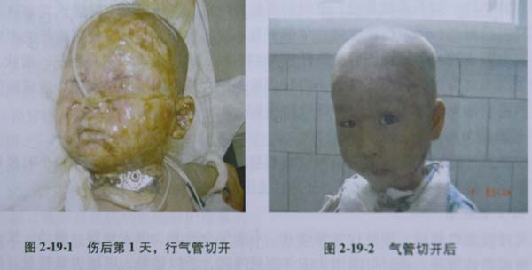 患兒系重度吸入性損傷,圖2191燒傷后第1天,持續(xù)低流量吸氧后,血氧飽和度波動在70%~90%,明顯痰鳴,雙肺散在濕啰音,三凹征,行氣管切開;圖2192切開后,出現(xiàn)氣管軟骨軟化,塌陷,所以,需長期帶氣管套管生活。