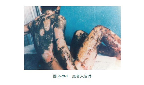 [病例]患者,男,34歲,硫酸燒傷,面積60%,(深Ⅱ度30%,淺Ⅲ度30%)創(chuàng)面焦痂呈黑色和棕褐色,外涂MEBO保護(hù)創(chuàng)面組織(圖2291)。