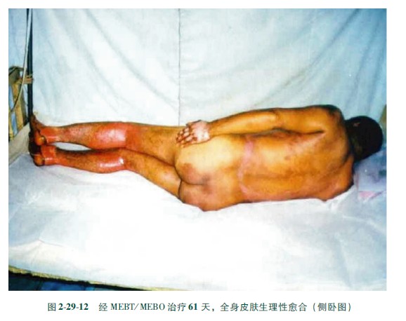 2)大面積燙傷處理方法及原則與中小面積燙傷基本相同。所不同的是由于燒傷面積越大,毒性物質(zhì)的吸收量越多,故應(yīng)根據(jù)對(duì)病人的監(jiān)測(cè)情況而定。一旦發(fā)現(xiàn)病人血或尿中濃度超標(biāo),或有中毒先兆,應(yīng)果斷進(jìn)行外科手術(shù)治療,同時(shí)加強(qiáng)對(duì)毒性物質(zhì)的中和治療與對(duì)癥治療。如燒傷面積雖然很大,但全身情況較好,可取程采用MEBT/MEBO治療。圖2299~22914展示的照片是高溫堿性液體致傷病例。