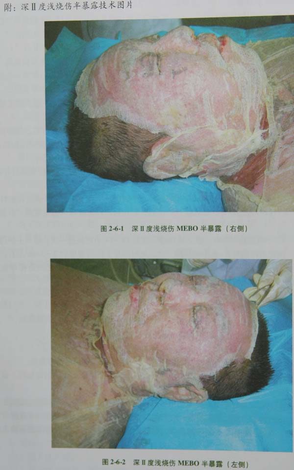 2大面積燒傷病人可先向創(chuàng)面涂一層MEBO,再在無菌床單上放置兩層無菌紗布。仰臥位使創(chuàng)面貼于無菌紗布上。間隔812小時(shí)更換一層MEBO,換藥時(shí)將藥紗、腐皮及創(chuàng)面液化物揭去,使創(chuàng)面清潔,再繼續(xù)涂藥敷紗布,達(dá)到通暢引流目的。這樣反復(fù)進(jìn)行,直至創(chuàng)面愈合。