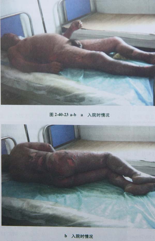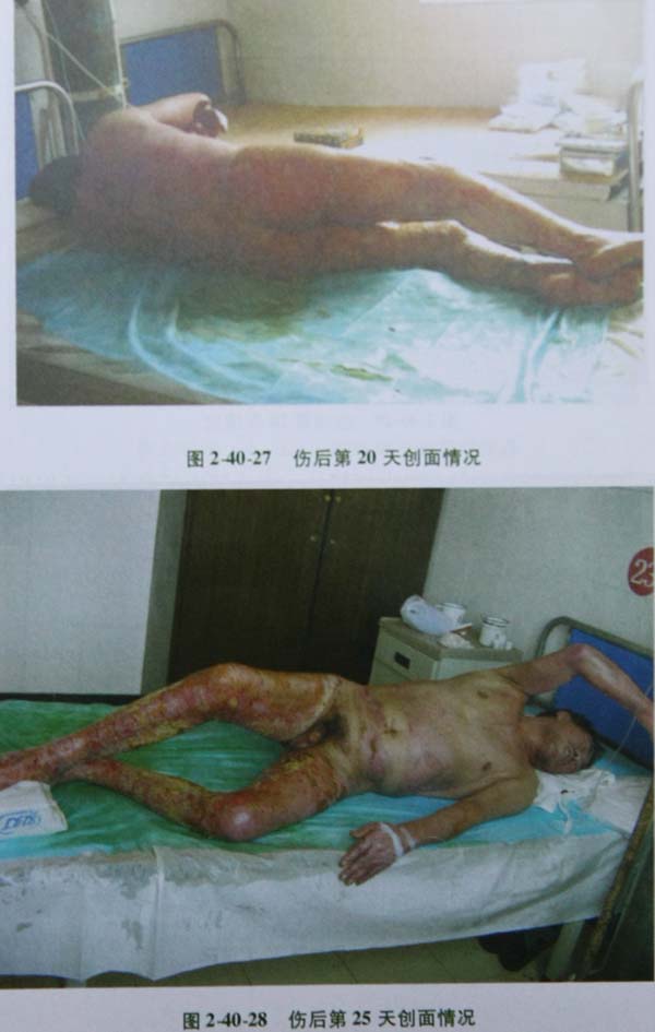 [病例2]患者陳××,男,55歲,江蘇省鹽城市射陽縣耦耕鎮(zhèn)解放村7組,浴室鍋爐工,因沸水燙傷周身3小時(shí)急診入院?;颊哂?005年5月28日中午,因工作時(shí)不慎滑入浴室沸水池內(nèi),掙扎3次約10秒鐘才從池中爬出,在就近一家醫(yī)院予以中藥油紗布包扎,并輸液治療(具體用藥不詳),3小時(shí)后轉(zhuǎn)入我院,途中訴口渴、無小便。入院體檢體溫355℃,心率110次/分,呼吸32次/分,血壓70/40mmHg,神志尚清,精神緊張,煩躁,呼吸稍急促,四肢厥冷,兩肺呼吸音粗,未聞及干濕性啰音,心率110次/分,律齊,未聞及明顯雜音,全身紗布包扎,打開敷料,見約有90%TBSA皮膚燙傷,創(chuàng)面有大小不等水皰多處,部分腐皮撕脫、皺折,創(chuàng)面基底紅白相間,以白為主,雙下肢創(chuàng)面呈蒼白色,痛覺遲鈍,皮溫涼。入院診斷:①沸水全身燙傷Ⅱ—Ⅲ度總面積90%TBSA(淺Ⅱ度20%,深Ⅱ度淺30%,深Ⅱ度深15%,Ⅲ度淺型25%);②休克。入院后病房室溫控制在28~30℃,相對濕度60%左右。立即予以吸氧,迅速建立靜脈補(bǔ)液通道,快速補(bǔ)液抗休克,補(bǔ)液原則參照燒傷皮膚原位再生技術(shù)抗休克補(bǔ)液公式,膠晶比例為1∶2左右,適當(dāng)調(diào)整輸液速度,將尿量控制在50~80mL/h。同時(shí)給予預(yù)防性應(yīng)用頭孢他啶防治感染,并應(yīng)用甘露醇,碳酸氫鈉,利尿合劑,雷尼替丁,毛花甙丙、多巴胺、654-2等藥物,以保護(hù)各臟器的功能。在作全身治療的同時(shí)簡單清創(chuàng),去除卷曲、皺折腐皮,低位剪破水皰引流,保留皰皮,Ⅲ度淺型創(chuàng)面行“耕耘減張療法”,以“不麻醉、不疼痛、不出血”為原則,然后創(chuàng)面外涂MEBO,厚度約1mm。查血常規(guī)(5月28日)RBC 672×1012/L,HGB 218g/L,WBC 386×109/L,N 85%,L 11%,M 4%,PLT 362×109/L,血型B型,尿常規(guī)正常,糞常規(guī)正常。