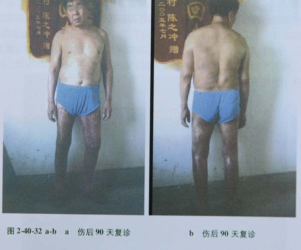 出院后30天(傷后90天)復(fù)診,愈后皮膚彈性好,深Ⅱ度未見明顯疤痕,Ⅲ度淺型有少量軟瘢痕,不影響膝關(guān)節(jié)功能,雙下肢有部分色素脫失。生活能自理,可參加正常的體力勞動(dòng)。