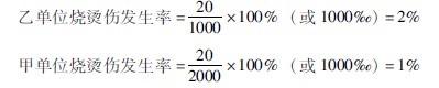 示例331甲單位共有職工2 000人,年內(nèi)發(fā)生燒燙傷者20例,乙單位共有職工1 000人,年內(nèi)發(fā)生燒燙傷者也為20例,試問他們的燒燙傷發(fā)生率分別為多少?