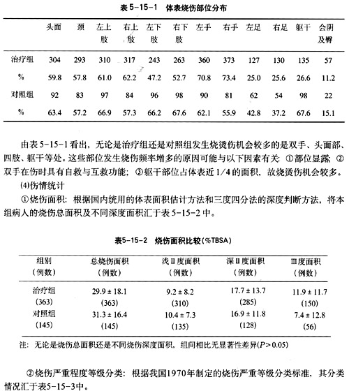 由表5-15-3看出,兩組病人重度和特重度燒傷均占較高比例,即治療組燒傷總面積大于50%BSA者,或是Ⅲ度燒傷面積超過20%BSA者已達75例;對照組31例,分別占各組例數(shù)的20.7%和21.3%,或者說,兩組重度以上燒傷病例已超過或接近總例數(shù)的40%。他們中最大燒傷面積者達94%BSA,同時Ⅲ度面積達73%BSA。由此說明,無論是治療組還是對照組,傷情都是相當(dāng)嚴重的,而目前在國內(nèi)外的治療難度也是相當(dāng)大的。