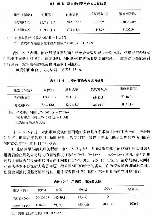 表5-15-9表明,對照組創(chuàng)面感染率明顯高于治療組,說明MEBO不僅不會增加燒傷創(chuàng)面感染機會,反而會降低其感染率。
