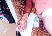 5-6-1 該病例電擊傷,手腕、前臂部位嚴重損傷。手腕前群肌肉全部壞死,尺橈動脈壞死,骨間動脈尚存活,上肢壓疼點至肘部