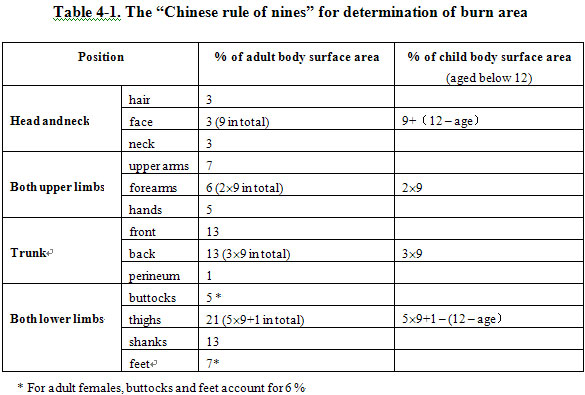 The head and neck is 9 % of the area of the whole body, two upper limbs is 18% (29), two lower limbs (including buttock) is 46% (59+1), the front and the back of the trunk (including perineum) is 27 % (39). This proportion may be different according to the patient’s age and gender. Therefore, some more accurate methods have been put forward. In 1970, “Chinese rule of nines” was named, this is based on the actual proportion of body surface area of Chinese people, and is now popularly applied (Table 1). In China, there is another rule named the “rule of tens” which considers the head and the neck area as 10 %, upper limbs 210 %, trunk (including perineum and buttock) 310 % and lower limbs 410 %. This method is also very simple and easy to apply.