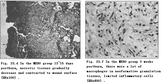 According to our experimental results, in the control group there was sparse blood capillary formation with narrow lumen. The tissue was swollen with fiber proliferation and massive infiltration of inflammatory cells. The disruption of collagen fiber and absence of regenerated epidermis to cover wounds eventually resulted in wound healing by eschar (showed in Fig. 22. d). In the experimental group treated with MEBO, residual skin appendages regenerated into epidermis with multilayers and large nuclei that progressed and covered the wounds (Fig. 23. b-d). Granulation tissue was promoted into regenerative tissue; neoformative blood capillaries were enhanced more than in the control group with larger lumen and richer blood supply, both of which facilitate an enhanced metabolism (Fig. 23. a). Finally, wounds in the experimental group were covered by squamous epithelia and healed without scarring (Fig. 23.g). We noted that when burns wounds were treated by BRT with MEBT/MEBO, the perpetually changing cells began to divide and proliferate toward the wound center along the wound edges or the basal part of residual epithelia, whereas after burns injury, the stable cells residing in skin appendages and grandular epithelium were activated to divide and regenerate into epidermic tissue that in turn migrated toward and finally closed the wound. Pathological examination on days 10-12 postburn showed a transitional migration from skin appendages to regenerated epithelia. When epithelia proliferated and divided, wounds were covered by stratified squamous epithelium. The macroscopic appearance of healed wounds was initially in red or pink and progressively became normal in color.