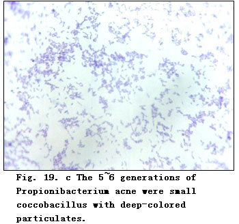 The 10th generation of B. pyocyaneus cultured in MEBO-containing media and the original B. pyocyaneus cultured in ordinary media were taken and diluted separatelyly to 3 x 106/ml. 0.1 ml of the bacteria solutions were injected into mice intracutaneously. After 20 h the mice were killed. A block of rectangular skin tissue to the muscular layer was taken from the injection site of each mouse. The tissue blocks were made into sections and stained with HE stain and observed.