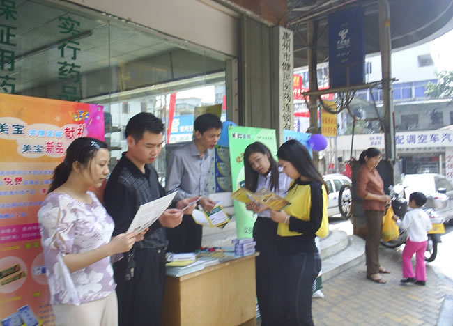 活動(dòng)中,在藥店外運(yùn)用美寶產(chǎn)品展架展示美寶產(chǎn)品,設(shè)立咨詢臺(tái)派發(fā)美寶系列產(chǎn)品宣傳資料,同時(shí),購(gòu)買美寶系列產(chǎn)品的消費(fèi)者可獲贈(zèng)由上海美寶生命科技有限公司研制的高科技產(chǎn)品“美寶降溫貼”,并可同時(shí)獲得咨詢服務(wù)。