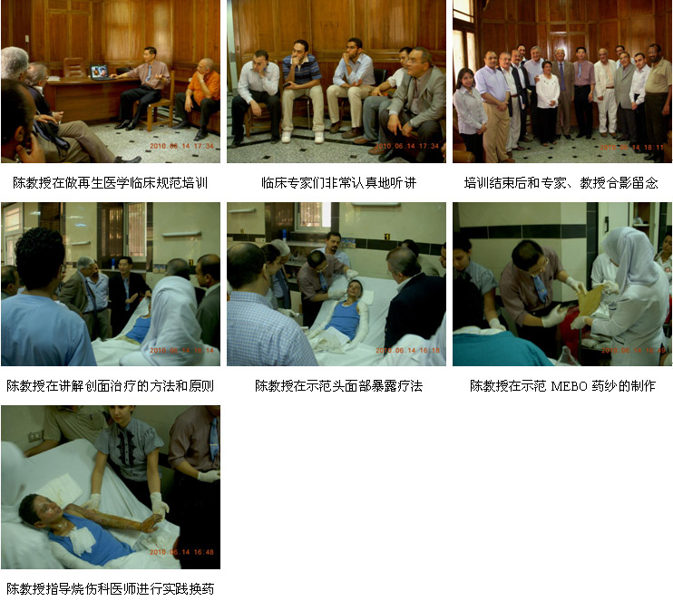 1、6月13日,北京榮祥再生醫(yī)學(xué)研究所副所長(zhǎng)陳永翀教授應(yīng)邀到開(kāi)羅大學(xué)第一醫(yī)院燒傷中心做燒傷再生醫(yī)學(xué)技術(shù)的專(zhuān)題演講和臨床病例治療的規(guī)范操作示范。開(kāi)羅大學(xué)第一醫(yī)院有病床5000多張,是埃及最大的醫(yī)院,其中燒傷中心有50張病床。培訓(xùn)和學(xué)術(shù)交流活動(dòng)在燒傷中心的示教室里進(jìn)行,埃及燒傷整形外科學(xué)會(huì)主席、燒傷中心主任Dr. & Prof. Fawzy Hamza 主持會(huì)議,來(lái)自該院和周邊幾家醫(yī)院的40多名燒傷整形外科醫(yī)師和護(hù)士(包括幾位資深的退休的老教授)參加了這次培訓(xùn)會(huì),陳教授的演講結(jié)束后,討論階段氣氛非常熱烈,專(zhuān)家、教授們不停地提問(wèn),而陳教授則耐心、認(rèn)真地一一解答,實(shí)現(xiàn)了很好的學(xué)術(shù)交流效果。隨后,陳教授應(yīng)邀給一位幼兒燒傷患者進(jìn)行示范換藥,當(dāng)大家看到在整個(gè)換藥過(guò)程中,患兒一點(diǎn)都不哭、不掙扎,而且還能夠主動(dòng)配合換藥時(shí),在場(chǎng)的專(zhuān)家無(wú)不感到神奇和信服。