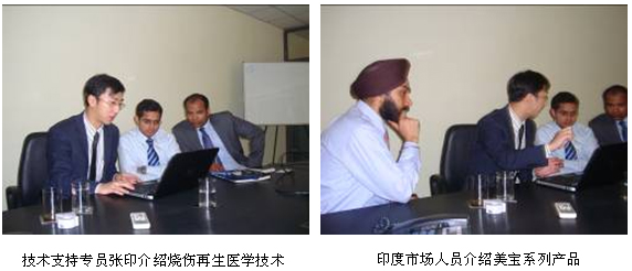 國(guó)際市場(chǎng)總部總裁孫霞、國(guó)際市場(chǎng)總監(jiān)劉鋼、印度市場(chǎng)經(jīng)理張印應(yīng)邀會(huì)見(jiàn)了印度第四十七大醫(yī)藥企業(yè)Jagsonpal, 就燒傷再生醫(yī)學(xué)技術(shù)與美寶燒傷膏等產(chǎn)品的商務(wù)合作事宜進(jìn)行了初步的會(huì)談。