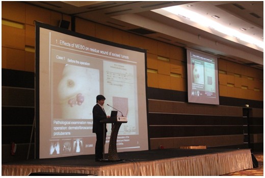 第三天會(huì)議繼續(xù)進(jìn)行,來(lái)自中國(guó)中西醫(yī)結(jié)合學(xué)會(huì)燒傷專業(yè)委員會(huì)國(guó)際部主任舒葉被安排在全體會(huì)議中第一個(gè)發(fā)言。他演講的題目是再生醫(yī)療技術(shù)在癌癥創(chuàng)面的應(yīng)用,這一世界性難題用美寶再生科學(xué)的解決吸引了所有與會(huì)代表的眼球。舒葉主任先從再生醫(yī)療技術(shù)成功治療典型病例入手,深入分析三例皮膚癌患者在手術(shù)切除、放療等治療后,殘余創(chuàng)面應(yīng)用再生醫(yī)療技術(shù)成功抑制創(chuàng)面殘余癌細(xì)胞生長(zhǎng)的病例。然后,重點(diǎn)展示對(duì)癌癥細(xì)胞在再生物質(zhì)環(huán)境下分別培養(yǎng)和共培養(yǎng)結(jié)果的基礎(chǔ)研究。單獨(dú)培養(yǎng)的結(jié)果表明再生物質(zhì)環(huán)境下,癌細(xì)胞會(huì)快速死亡;非再生物質(zhì)環(huán)境下,癌細(xì)胞會(huì)迅速增殖分化,正常細(xì)胞會(huì)迅速被癌細(xì)胞吞噬。癌細(xì)胞和正常細(xì)胞的共培養(yǎng)結(jié)果顯示,在再生物質(zhì)環(huán)境下,正常細(xì)胞會(huì)逐漸增殖、分化形成新的組織;而在對(duì)照組中,癌細(xì)胞會(huì)迅速擴(kuò)張,正常細(xì)胞消失?;A(chǔ)研究的結(jié)果表明再生物質(zhì)具有抑制并殺死癌細(xì)胞,同時(shí)促進(jìn)正常細(xì)胞生長(zhǎng)的雙重功效。結(jié)合臨床真實(shí)的病例展示,再生醫(yī)療技術(shù)在癌癥方面的功效及研究吸引了全體與會(huì)人員的關(guān)注。會(huì)后,多名醫(yī)生詢問(wèn)具體情況,并索要相關(guān)論文,要在當(dāng)?shù)亻_(kāi)展使用。