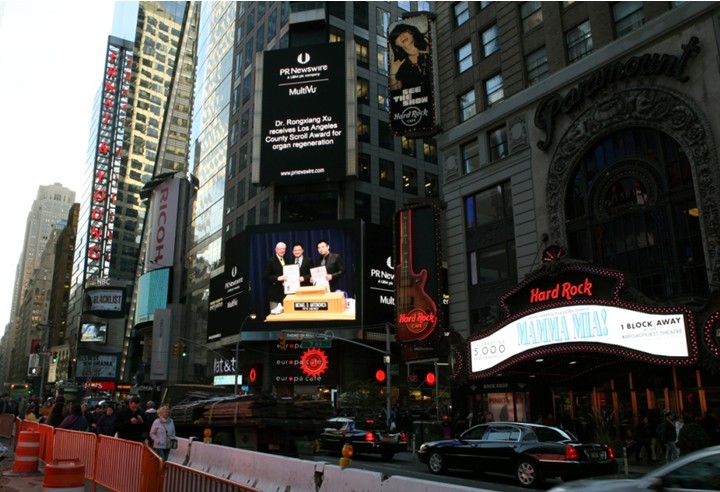 近日路透社刊發(fā)了徐榮祥父子獲得洛杉磯SCROLL AWARD最高榮譽(yù)獎(jiǎng)的新聞,同時(shí)在紐約時(shí)代廣場(chǎng)的大屏幕上刊出洛杉磯政府頒給徐榮祥父子獎(jiǎng)的照片。
