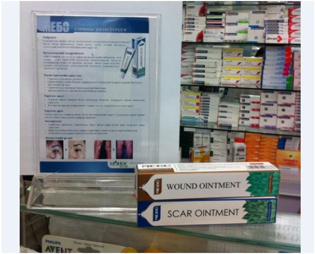 圖為美寶產(chǎn)品在一家叫Island的藥店,創(chuàng)傷膏銷量排名第二,僅次于多年前進(jìn)入蒙古市場的一款俄羅斯創(chuàng)傷產(chǎn)品,其價(jià)格是美寶產(chǎn)品的五分之一。