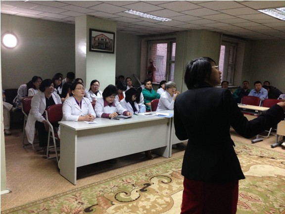 2月20日中午12點(diǎn),美寶團(tuán)隊(duì)來到烏蘭巴托的青格爾泰區(qū)中心醫(yī)院,培訓(xùn)內(nèi)容涵蓋了出席的20位醫(yī)生專業(yè)領(lǐng)域,包括再生療法在糖尿病潰瘍,褥瘡,靜脈潰瘍,創(chuàng)傷,手術(shù)創(chuàng)面及婦科應(yīng)用。醫(yī)生們對(duì)展示的典型案例很感興趣,詢問了具體的治療過程,換藥操作,并且又一次表達(dá)了試用疤痕平的愿望。Myadagmaa 醫(yī)生是該院的婦產(chǎn)科醫(yī)生,看到展示的婦科手術(shù)創(chuàng)面的應(yīng)用后,急切的咨詢在婦科方面的其它應(yīng)用,張美艷介紹了再生療法在宮頸電環(huán)切除術(shù),剖腹產(chǎn)手術(shù),腹腔鏡手術(shù),會(huì)陰切開術(shù),會(huì)陰撕裂傷及宮頸糜爛等方面的應(yīng)用,與醫(yī)生互換了名片,贈(zèng)送了美寶的學(xué)習(xí)光盤及幾年品,答應(yīng)通過郵件等方式解答病例咨詢及臨床應(yīng)用問題。