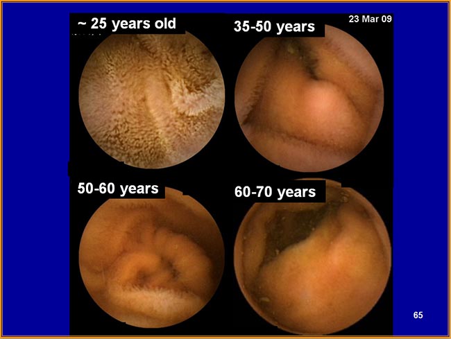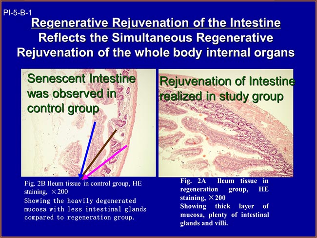 下面再來(lái)介紹我們的實(shí)驗(yàn)結(jié)果,中年大白鼠喂養(yǎng)試驗(yàn),這個(gè)實(shí)驗(yàn)大家都可以重復(fù)做。我們用再生的方法,給大白鼠喂養(yǎng)再生物質(zhì),喂養(yǎng)到兩倍的年齡時(shí),沒(méi)有喂養(yǎng)再生物質(zhì)的大白鼠都死了,而喂養(yǎng)再生物質(zhì)的大白鼠不但沒(méi)有死,而且還活得更年輕,這些大白鼠所有的器官都是再生更新過(guò)的,有一些老的器官經(jīng)過(guò)再生更新后,通過(guò)新的染色的方法都可以明顯表現(xiàn)出來(lái)。這個(gè)試驗(yàn)結(jié)果是向人們昭示,再生營(yíng)養(yǎng)物質(zhì)除了能夠使細(xì)胞再生更新,還滿足了人類追求“長(zhǎng)生不老”的向往,人可以活到200歲到300歲。但這需要很多的技術(shù)配合才能實(shí)現(xiàn)。接下來(lái)我再介紹人體內(nèi)部器官的再生復(fù)原和完成,我們可以看到衰老的胃腸組織、腸壁、腸腺、腸絨毛,但這些都是年輕的腸絨毛。在另外一副圖中可以看到每個(gè)年齡段胃腸道的變化情況。從20歲到70歲胃腸道的變化。20歲之前是這樣,50歲之前是這樣,60歲以前是這個(gè)狀態(tài),70歲以前的是這個(gè)狀態(tài)。(圖3)我們是要把70歲胃腸道狀態(tài)變成20歲胃腸道的樣子,衰老變成年輕的,這些我們都已經(jīng)成功做到了。這就是科學(xué)運(yùn)用的結(jié)果。美國(guó)的再生科學(xué)領(lǐng)袖講道:“我們?cè)隗w外建立一個(gè)模型都很難,而你們還能讓器官原位長(zhǎng)出來(lái)。”下一步我們會(huì)在國(guó)際上找300個(gè)病例來(lái)進(jìn)行公開(kāi)再生還童,一年之內(nèi)讓衰老的胃腸變年輕。我想,當(dāng)我們完成這項(xiàng)工作后,世界人民會(huì)歡呼,人類可以享受這一全新的科學(xué)啦。