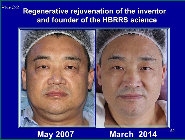 我們的人體再生復(fù)原科學(xué)應(yīng)用已經(jīng)有很多成功的結(jié)論了。皮膚是人體最大的器官,皮膚的變化代表著人體內(nèi)部的變化,大家可以看這兩張照片分別是我40多歲和將近60歲的照片(圖2),我的變化大嗎?這個(gè)變化用美容手術(shù)是不能實(shí)現(xiàn)的,我們的再生技術(shù)會(huì)使人變得年輕,我們希望不只是皮膚,希望全身其它臟器官都可以變年輕。一位志愿者在2007年與2014年的照片也就是50多歲與61歲時(shí)的對(duì)比照片,觀察其外貌,已經(jīng)返老還童,現(xiàn)在比2007年前更年輕。女士想保持年輕,想變漂亮,男士也一樣。還有一位志愿者,是我們國(guó)家的前領(lǐng)導(dǎo)人,2005年88歲,2013年96歲,通過(guò)這樣的對(duì)比其容貌返老還童,96歲的老人看起來(lái)依然是身體健壯,精神矍鑠,比88歲時(shí)年輕了很多。首長(zhǎng)告訴我們:“不管怎么樣,服用再生物質(zhì)沒(méi)有壞處,我現(xiàn)在身體很好,腦子變聰明了,已經(jīng)6年多沒(méi)有去醫(yī)院看過(guò)醫(yī)生了。”