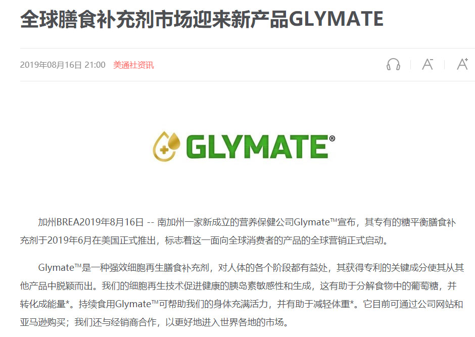 加州BREA2019年8月16日 -- 南加州一家新成立的營養(yǎng)保健公司Glymate™宣布,其專有的糖平衡膳食補(bǔ)充劑于2019年6月在美國正式推出,標(biāo)志著這一面向全球消費(fèi)者的產(chǎn)品的全球營銷正式啟動。