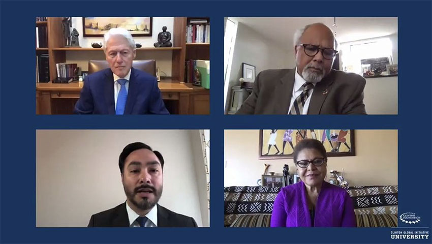 會議伊始,克林頓致歡迎辭后便與美國紐約州長庫默就如何應(yīng)對新冠肺炎疫情在紐約的大流行進行了討論;而后與包括美國第19屆衛(wèi)生部長維韋克·默西博士在內(nèi)的健康領(lǐng)域的專家重點討論了年輕人、衛(wèi)生領(lǐng)域工作者及衛(wèi)生系統(tǒng)如何相互支持、有效應(yīng)對這一全球緊急情況,共抗新冠肺炎疫情;下午則又與加州州長加文·紐森進一步討論如何應(yīng)對新冠肺炎疫情大流行;而在“新冠肺炎疫情及以后:建立彈性機制應(yīng)對全球衛(wèi)生挑戰(zhàn)”這一主題下集中討論了新冠肺炎疫情對社會各個方面包括更廣泛的的經(jīng)濟、醫(yī)療和教育系統(tǒng)的影響,還探索了政府及非營利組織在此次疫情期間學(xué)到的經(jīng)驗教訓(xùn),以便未來更好的應(yīng)對全球衛(wèi)生挑戰(zhàn);會議還特別對新冠肺炎疫情因資源不均衡造成的不同種族受到的不同影響進行了探討。借助此次CGIU,各方就新冠肺炎疫情在經(jīng)濟、社會、衛(wèi)生健康安全等問題進行了不同形式、不同主題的多元化討論,眾多政治領(lǐng)袖及專家學(xué)者針對應(yīng)對全球疫情中出現(xiàn)的新現(xiàn)象、新問題積極發(fā)聲,貢獻智慧觀點和全新價值。
