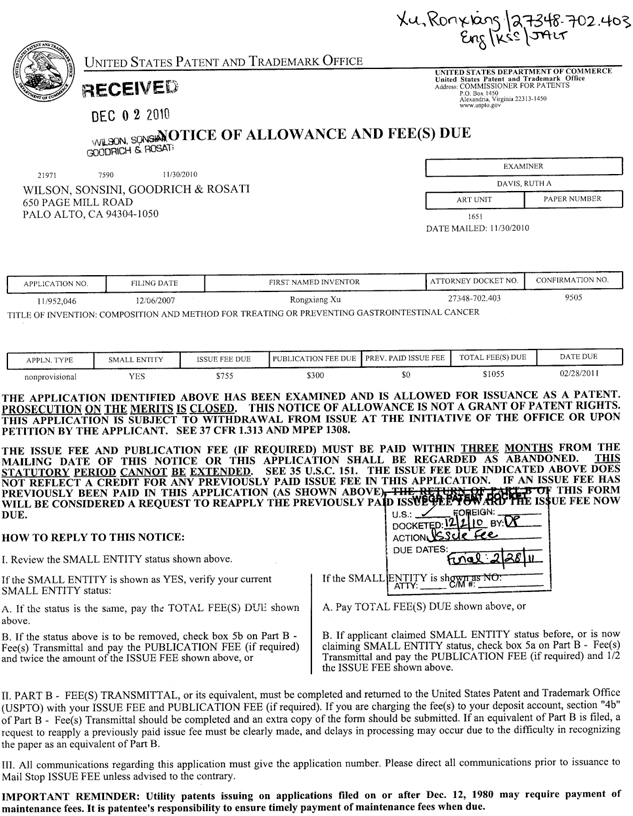 在辭舊迎新之際,集團(tuán)的喜事不斷,禮包不斷,近日,再接到從美國專利局傳來的振奮人心的喜訊,再生生命科學(xué)創(chuàng)始人徐榮祥教授的“治療與預(yù)防胃腸道癌癥方法”的專利已獲得正式授權(quán)。該專利是繼徐教授在獲得系列專利權(quán)之后,在人體再生復(fù)原科學(xué)研究和科學(xué)成果確認(rèn)的又一重大進(jìn)展與突破。至此,徐教授已獲得美國、日本、歐洲、加拿大等主要國家23項(xiàng)發(fā)明專利。再一次證實(shí)了在生命科學(xué)領(lǐng)域,話語權(quán)牢牢的掌握在美寶人手中,在知識(shí)產(chǎn)權(quán)發(fā)展過程中的具有重要意義“治療與預(yù)防胃腸道癌癥配方和方法”是美寶科研成果實(shí)際臨床應(yīng)用的重要成就,近年來,胃腸道癌癥的發(fā)病率居高不下,嚴(yán)重威脅著人類生命健康,傳統(tǒng)醫(yī)療手段效果不佳。該專利技術(shù)的問世,不啻是為人類健康帶來的天大福音。根據(jù)這一專利開發(fā)的技術(shù)和產(chǎn)品,可以利用人體的再生潛能,為解決人類胃腸提前衰老,治療和預(yù)防癌癥的發(fā)生,為目前醫(yī)學(xué)手段難以解決的胃腸道癌癥預(yù)防與治療提供了全新的解決辦法,以徐榮祥教授為核心的美寶科研團(tuán)隊(duì)在再生生命科學(xué)領(lǐng)域里所取得的這一前沿臨床應(yīng)用成果,為人類再生生命科學(xué)發(fā)展道路上具有新的里程碑式的意義。