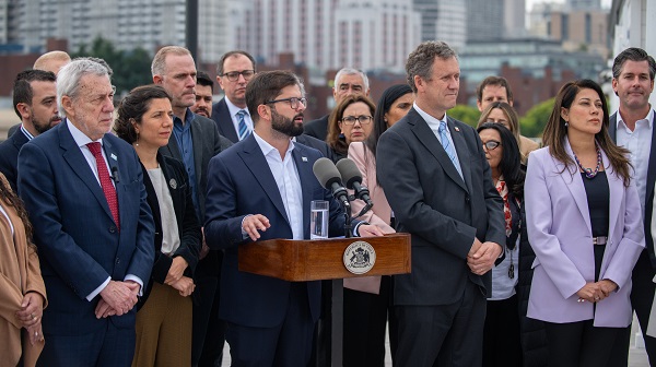 智利總統(tǒng)加夫列爾·博里奇在灣區(qū)委員會(huì)克拉馬斯號(hào)頂層“美寶花園”發(fā)表演講