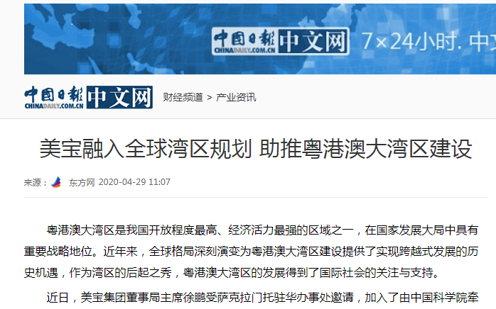 中國(guó)日?qǐng)?bào):美寶融入全球?yàn)硡^(qū)規(guī)劃 助推粵港澳大灣區(qū)建設(shè)