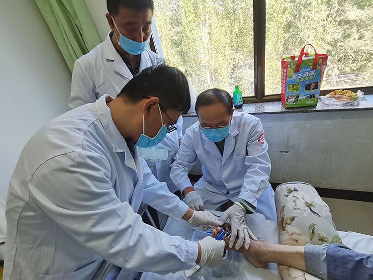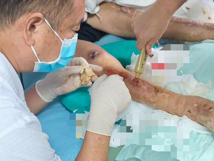 2025年9月25日,《中國燒傷創(chuàng)瘍雜志》常務編委、燒傷創(chuàng)瘍再生醫(yī)療技術(shù)臨床專家趙瑞慶在朔州市大醫(yī)院會診了四例慢性創(chuàng)面患者。其中1例4級糖足,其余3例冠脈搭橋術(shù)后下肢取血管處感染,足部外傷感染等均為VSD治療患者,討論環(huán)節(jié)趙教授強調(diào)了糖足規(guī)范,程序操作的要求以及簡易負壓方法壓力管理的重要性。
