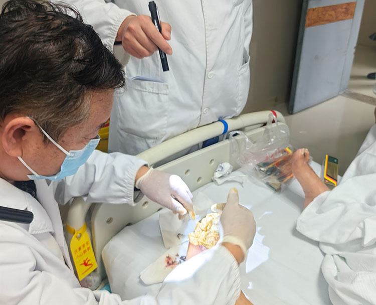 2025年10月30日,《中國(guó)燒傷創(chuàng)瘍雜志》編委、燒傷創(chuàng)瘍?cè)偕t(yī)療技術(shù)臨床專家張強(qiáng)主任應(yīng)邀前往定遠(yuǎn)縣總醫(yī)院創(chuàng)面修復(fù)科,會(huì)診多例糖足和創(chuàng)面患者。張主任深入病房指導(dǎo)并示范再生醫(yī)療技術(shù)規(guī)范化臨床應(yīng)用,結(jié)合患者病情制定后續(xù)治療方案,受到醫(yī)護(hù)人員高度贊賞。
