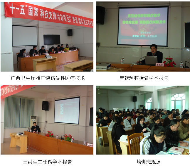 當(dāng)日上午9:30分,開(kāi)幕式結(jié)束后,適宜技術(shù)培訓(xùn)班正式開(kāi)始,王洪生研究員應(yīng)邀首先以“燒傷濕性醫(yī)療技術(shù)臨床規(guī)范化應(yīng)用和再生療法在難治性創(chuàng)瘍治療新進(jìn)展”進(jìn)行了專題臨床學(xué)術(shù)講座;接下來(lái),中國(guó)中西醫(yī)結(jié)合學(xué)會(huì)燒傷專委會(huì)副主任委員、廣西中西醫(yī)結(jié)合學(xué)會(huì)燒傷分會(huì)主委、廣西中醫(yī)學(xué)院科技處處長(zhǎng)、“十一五”國(guó)家科技支撐計(jì)劃項(xiàng)目燒傷濕性醫(yī)療技術(shù)臨床規(guī)范化應(yīng)用等5項(xiàng)適宜技術(shù)課題負(fù)責(zé)人唐乾利教授,做了“規(guī)范燒傷濕性醫(yī)療技術(shù)的臨床應(yīng)用,預(yù)防醫(yī)療糾紛發(fā)生”的專題講座。燒傷濕性醫(yī)療技術(shù)研究方向的碩士研究生趙乙飛、任文東等對(duì)金秀縣人民醫(yī)院桐木分院、金秀縣瑤醫(yī)院的燒傷、創(chuàng)瘍病人進(jìn)行了現(xiàn)場(chǎng)技術(shù)指導(dǎo)。
