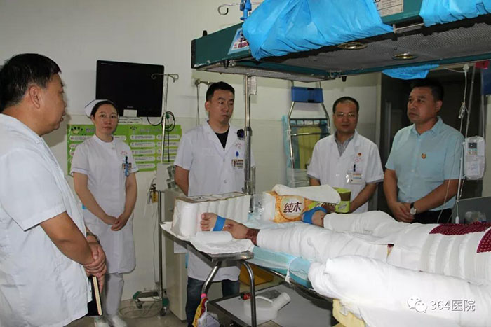 9月5日上午,中國(guó)紅十字基金會(huì)徐榮祥再生生命公益基金志愿者黃彥勇一行,在364醫(yī)院黨委書記、院長(zhǎng)李廣衡和副院長(zhǎng)張鋒、劉永良的陪同下,來(lái)到航空工業(yè)襄陽(yáng)醫(yī)院(364醫(yī)院)燒傷科重病監(jiān)護(hù)室,看望慰問(wèn)特重度燒傷患者任海鵬及其家屬龍榮榮。