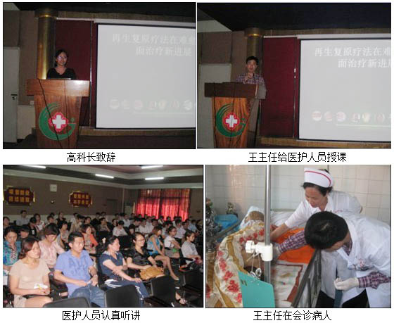 2012年4月13日上午,應廣東省農(nóng)墾中心醫(yī)院之邀,中國中西醫(yī)結(jié)合學會燒傷專業(yè)委員會常委兼秘書、《中國燒傷創(chuàng)瘍雜志》副總編輯、北京美寶燒傷創(chuàng)瘍研究所副所長、第二臨床研究部主任王洪生研究員到醫(yī)院做“再生復原療法在深度燒傷及難愈性創(chuàng)面治療新進展”專題學術講座。廣東省農(nóng)墾中心醫(yī)院全院的醫(yī)護人員均參加了此次培訓,在學術講座中,王主任首先向與會的專家介紹了著名生命科學家、醫(yī)學家、人體再生復原科學的創(chuàng)立者、再生復原療法的發(fā)明人徐榮祥教授近年來在再生醫(yī)學領域所取得的重大實驗及臨床研究成果,而后王主任結(jié)合了大量的臨床病例圖片及錄像資料,主要針對深度燒傷及各類難愈性創(chuàng)傷、潰瘍創(chuàng)面的規(guī)范化處理方法與技巧、注意事項等進行了細致地講解,在座的各位醫(yī)護均被這神奇的療法折服。會后,醫(yī)護人員向王主任詢問了臨床上所遇到的問題,王主任一一作了詳細解答。該醫(yī)院醫(yī)務科高科長作總結(jié)發(fā)言時,高度贊揚了再生復原療法,稱之為一種為患者帶來福音的一種療法。隨后,應高科長和老年科護長的邀請,王主任親自到老年科對一名深度褥瘡患者進行了會診,并提出治療建議。