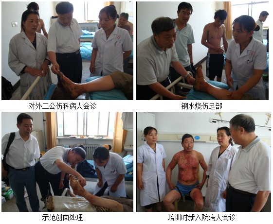 2009年6月9日中國中西醫(yī)結(jié)合學(xué)會燒傷專業(yè)委員會常委、北京美寶燒傷創(chuàng)瘍研究所臨床部研究員、燒傷創(chuàng)瘍專家金黨軍主任和山西省辦事處董在新、張堯同志一起走訪了太谷縣中醫(yī)院,和外科曹新亮主任進(jìn)行了再生復(fù)原醫(yī)療技術(shù)的臨床應(yīng)用交流。早上九點我們在外科曹主任的帶領(lǐng)下會診了醫(yī)院的6位燒傷病人、六位都是鐵水燒傷,面積小,屬于重度燒傷,在會診完這六位病人后,金教授結(jié)合住院病人的創(chuàng)面處理情況、給全科醫(yī)人員講了燒傷再生復(fù)原醫(yī)療技術(shù)臨床規(guī)范應(yīng)用培訓(xùn)課。