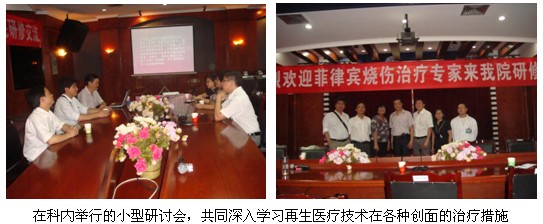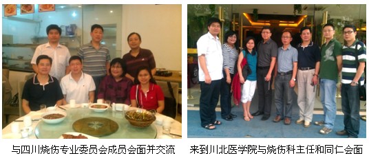 2011年6月19日至7月2日,菲律賓兩名高年資燒傷整形科專家,Dr. Mijares及Dr. Sy分別來到中國中西醫(yī)結(jié)合學(xué)會基地醫(yī)院:四川省南充市川北醫(yī)學(xué)院附屬醫(yī)院及雅安市人民醫(yī)院進(jìn)行參觀學(xué)習(xí)再生醫(yī)療技術(shù),中國中西醫(yī)結(jié)合學(xué)會燒傷專業(yè)委員會四川分會的胡棟材教授,邱為東秘書長,川北醫(yī)學(xué)院附屬醫(yī)院燒傷科主任周國富教授,雅安市人民醫(yī)院燒傷科主任兼燒傷專業(yè)委員會副主任委員付子俊教授熱烈歡迎并進(jìn)行了大量的學(xué)術(shù)指導(dǎo)和生活。中國中西醫(yī)結(jié)合學(xué)會燒傷專業(yè)委員會對外辦公室舒葉陪同翻譯。
