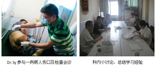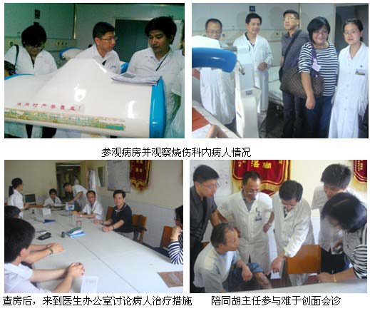 2011年6月20日至6月24日,兩名國外專家在南充市川北醫(yī)學(xué)院附屬醫(yī)院燒傷科參觀學(xué)習(xí)。其間,在周國富主任醫(yī)師,項曉燕主治醫(yī)師,陳剛主治醫(yī)師及其他科內(nèi)醫(yī)護(hù)人員的帶領(lǐng)下,外國專家每天到病 房觀察燒傷病人創(chuàng)面在再生醫(yī)療技術(shù)的幫助下,如何一天天原位再生復(fù)原;同時,為了更好的達(dá)到此次學(xué)習(xí)目的,在科內(nèi)專門組織了數(shù)次科內(nèi)的小型討論會,專門對大面積燒傷患者系統(tǒng)治療方面如何進(jìn)行補(bǔ)液,抗感染等要點(diǎn)作了深入的研討;通過深入回顧科內(nèi)年初成功搶救的一例大面積燒傷患者的病歷資料,國外專家對系統(tǒng)治療的要點(diǎn)有了深刻的把握,尤其是與傳統(tǒng)方法的區(qū)別。