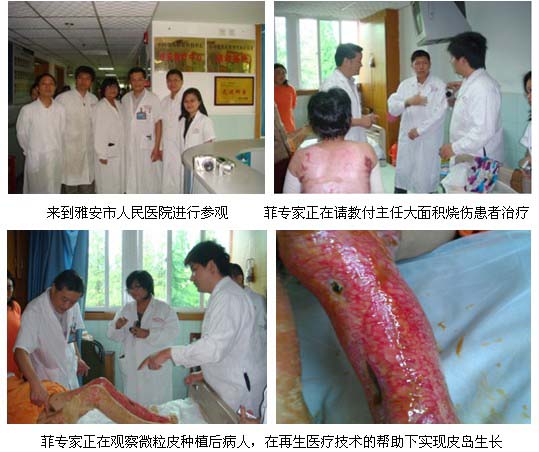 2011年6月27日至7月2日,兩名專家來到雅安市人民醫(yī)院燒傷科進(jìn)行學(xué)習(xí)再生醫(yī)療在介紹了微粒皮種植的流程;其間有一例患者正從微粒皮種植的手術(shù)中逐漸恢復(fù),傷口上生長的皮島正在連接成片。付主任解釋說,如果按照傳統(tǒng)的方法換藥,種植的微粒皮是不可能在創(chuàng)面上存活并且生成皮島,正是有了再生醫(yī)學(xué)技術(shù)獨(dú)有的干細(xì)胞培養(yǎng)過程,才使得微粒皮種植培養(yǎng)皮島得以實現(xiàn)。此外,除了燒傷病人,各種外傷及慢性創(chuàng)面患者也都在再生醫(yī)療技術(shù)的幫助下獲得了良好的治療和康復(fù)。Dr. Mijares盡管只有一年再生醫(yī)療技術(shù)的使用經(jīng)驗,但仍然驚訝于再生醫(yī)療技術(shù)在多學(xué)科應(yīng)用所取得的成就并且表示回國后將致力于再生醫(yī)學(xué)在菲律賓的發(fā)展。