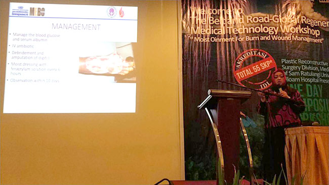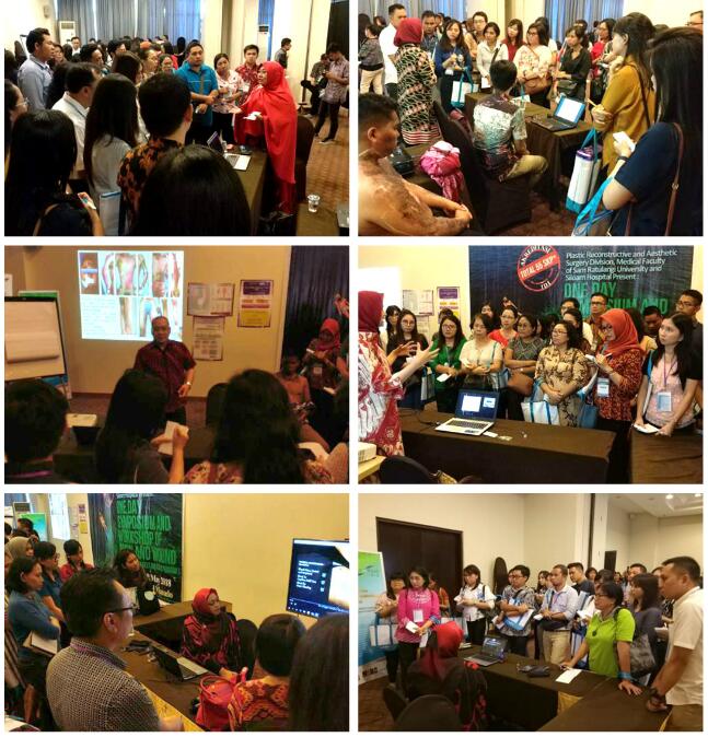 會議中,來自雅加達(dá)的Dr. Vika Tania/Dr. Afriyanti Sandhi/Dr. Aditya Herwandar講解了燒傷創(chuàng)瘍?nèi)梭w復(fù)原的基本理論; Dr. Aditya Herwandar/Dr. Donna Savitry/Dr. Puri Ambar Lestari則就創(chuàng)瘍的再生醫(yī)學(xué)基本護(hù)理進(jìn)行了闡述;Dr. Donna Savitry/Dr. Laksmi Achyati/Dr. Afriyanti Sandhi則以再生醫(yī)學(xué)燒傷的基本護(hù)理為主題展開論述;而Dr. Vika Tania/Dr. Puri Ambar Lestari則通過燒傷病例的分享讓大家更好的了解這一技術(shù);Dr. Mendy H.Oley/Dr. Maximillian Ch.Oley則分享了治療過程中控制疼痛的方法。隨后在場200余位參會者分六組進(jìn)行了討論,以燒傷在不同場景和情況下的急救措施和后續(xù)護(hù)理為重點(diǎn)進(jìn)行了熱烈的交流。